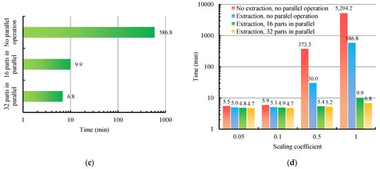 Time needed for image mosaicking in different situations: (a) overlapping area extraction or not (no scaling compensation or parallel operation); (b) different downsampling degrees of overlapping areas (no parallel operation); (c) different parts in parallel (no downsampling); (d) mosaic times of the contrast experiments in all situations.