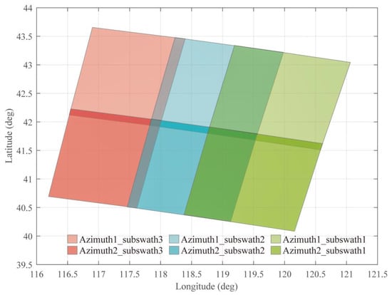 The antenna spends a fixed time transmitting a set of pulses (i.e., a burst) and receiving echo data on each subswath []. Then, the radar beam is switched to the next subswath, and the above-mentioned process is repeated until all the subswaths are scanned once. A period of scanning is completed when the antenna returns to the point of the first subswath. The working mechanism of spaceborne ScanSAR shows that there is a time gap between two bursts in the same subswath, which means that the azimuth resolution of the ScanSAR image is sacrificed. Moreover, the wide-range swath is composed of multiple subswaths with independent echo data phases. Therefore, stitching the imaging results of each subswath into a smooth and seamless wide image is an effective approach.