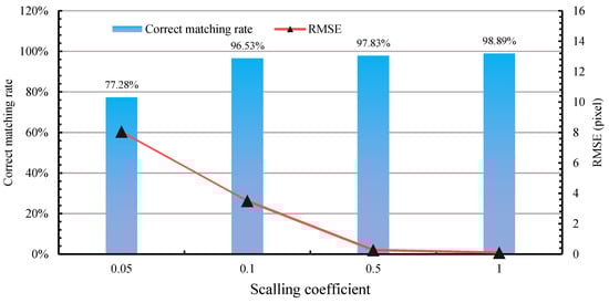 where is the number of pixels, are the correct coordinates and are the experimental coordinates. Figure 12 shows the correct matching rate and the RMSE at the different scaling coefficients.