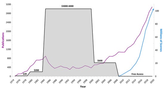 Annual publications that included “Landsat” in title, abstract, or keywords within the Scopus database (purple line), Landsat scene downloads from USGS archive (blue line), and Landsat image price (black line) (Source: USGS [22]) showing the impact of Landsat data policy through time on the usage of Landsat data.