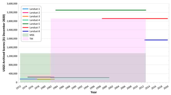 As a result of the Landsat Global Archive Consolidation (LGAC), the USGS Landsat archive contains around 9.2 million Landsat Level-1 images as of 31 December 2020 (see Figure 3). Additionally, with the new data acquisition policy, ~1200 new observations are added to the USGS archive each day from Landsat-7 and -8, and multiple million images are downloaded per year [9]. Since implementation of free data policy in 2008, many new applications have been developed. These new algorithms have increased the total number of downloaded images from USGS, which now surpasses the 100 million mark.