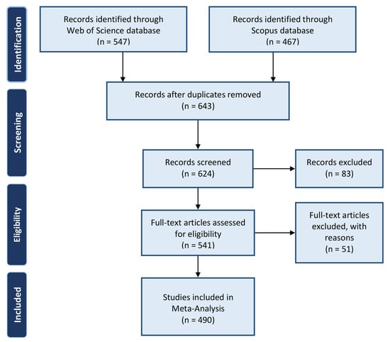 On 14 August 2020, a search of two scientific databases, Web of Science and Scopus, was done for articles containing “Change Detection” OR “Land Cover Change” with “Landsat” and “Time Series” in the title, abstract or keywords, from 1970 to 2020. The Preferred Reporting Items for Systematic Reviews and Meta-Analyses (PRISMA) [61] proposed method was followed (see Figure 4). After removing duplicate results, 643 articles were screened and 490 titles were selected for the systematic review. Landsat data have been used in several scientific fields and in some of them the data only used as an ancillary data or for validation purposes. Articles from non-remote sensing sources that did not use change detection methods or Landsat images as the primary data were excluded from the database. In addition, review papers and articles written in non-English languages were excluded.