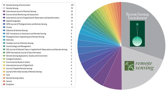 Landsat change detection research is published in journals of various fields, from remote sensing to ecology, demonstrating the relevance of Landsat change detection to many different scientific communities. In several of these studies, Landsat change detection results are considered a reliable source of data for comparing and evaluating non-remote sensing data. These products are also useful to demonstrate land use changes and their related impacts on the environment. Of 490 papers and 129 journals, Remote Sensing of Environment and Remote Sensing journal have the largest number of publications that applied Landsat data for change detection, featuring a total of 107 and 70 articles, respectively (Figure 6).