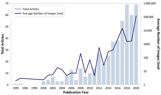 As shown in Figure 7, since 2008, there is an increasing number of Landsat change detection articles, largely because of the Landsat free-data policy. The availability of free data and improvements in data storage capacity significantly contributed to the exponential increase in the average number of Landsat images used in the articles reviewed (see Figure 7). Most recently, online repository and APIs with cloud computing platforms enabled researchers to easily use thousands of Landsat images. For example, Pickens et al. (2020) used 3.4 million Landsat images for mapping inland water dynamics through GEE [64].