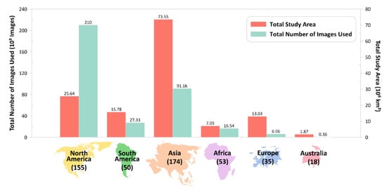 Landsat change detection studies cover a range of geographical scales, from small- to global-scale applications. Four of the reviewed studies produced global results using Landsat data [64,65,66,67], while several other studies produced continental and country-wide results for Africa [68], Australia, China, the United States [69], Eastern Europe, and Russia [70], for example. Most large-area studies were implemented in the GEE platform, which is capable of handling a massive amount of data. Figure 8 shows by continent the total number of study areas and the total number of Landsat images used. As illustrated, studies in Asia applied Landsat data to map large study areas, whereas studies in North America incorporated more Landsat images in their analysis compared to other continents (through the inclusion of a temporal element).