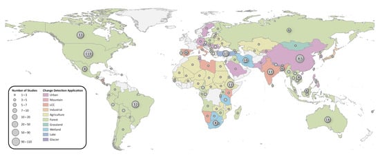 The geographic distribution of Landsat change detection studies for different applications.