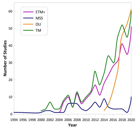 Usage of different Landsat sensors in studies over time.