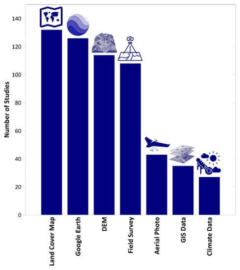 Ancillary data are commonly used for preparing reference data or increasing the accuracy of results. As seen in Figure 12, land cover maps are the most common type of ancillary data used in Landsat change detection studies. Existing land cover maps are useful to determine the area and type of land cover within a given study area and are often a reliable source for collecting reference data. Historical land cover maps are usually in paper-form and should be digitized for integrating into a GIS or remote sensing framework. After digitization, historical land cover maps are one of the few reliable sources of reference data for evaluating the results of a time series. Google Earth provides access to high-resolution optical data from as early as 2000. Historical aerial photos are usually used for selecting training and validation data. Topographic data and digital elevation models (usually SRTM global 30 m data) are most often used for radiometric corrections of remote sensing imagery. Topographic characteristics, such as aspect and slope, are also extracted from DEM data and are used to improve classification accuracy. Field data, which is usually collected with GPS with a relatively high cost, is the most reliable source of reference data. Climate data are usually used to understand the relationship between land cover changes and climate.