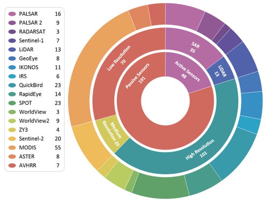 Various sources of Earth observation data can be combined with Landsat data to improve the spatial or temporal resolution of change detection products (see Figure 13). High-resolution satellites are usually used for deriving reference data and image interpretation. Increasingly, Sentinel-2, as a Landsat-like medium resolution EO sensor with higher spatial resolution, is combined with Landsat data for change detection (Figure 13) [72,73,74,75]. With cross-calibration of Landsat 8, Sentinel-2A, and Sentinel-2B, a near-2.5 day global data coverage, an overall increased spatial resolution (from Sentinel), and historical radiometric consistency (from Landsat), can be achieved. However, MODIS data and products are currently the data most often fused with Landsat, totaling 55 studies.