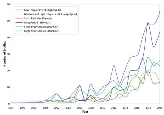 Applications of change detection are expected to increase spatially and temporally over time given the increasing availability of data and computational power. Among the reviewed papers, 99 used all available data, 85 used more than one image per year, 58 used an image for each year, and 248 studies used less than one image per year. As shown in Figure 14, studies using one or more images per year are increasing. Early studies often used pairs of images or a single image for only a limited number of years (e.g., one image for every 5 years), but today, annual or interannual changes such as vegetation phenology are easily monitored. High-frequency Landsat change detection using all available data and dense time series are recently achievable with a cloud computing platform and robust change detection methods [60,88,89].