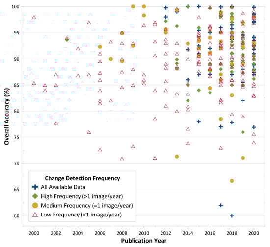 Although the accuracy of change detection methods depends on several factors, such as number of classes, class types, complementary data, study area, and applications, different methods achieve a range of different accuracies (see Figure 18). Statistical methods such as CCDC [60] and BFAST [91] achieved high accuracies using all available data. Post-classification methods have a range of accuracies depending on use of different classification methods. Some methods that used only for a single land cover type, such as the Vegetation Change Tracker (VCT) [92] and LandTrendr [93], used for forest change detection, have demonstrated science and application relevant results.