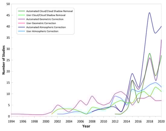Geometric correction is one of the key requirements for time series analysis. Small miss-registrations can result in noise, which may be incorrectly attributed as a meaningful change in different algorithms. Additionally, the geometric accuracy of results is required for optimal usage in GIS systems. Geometric corrections have been carried out by users in early applications of Landsat data with a few images. In particular, coregistration was usually done using other maps or images with a reliable geometric accuracy. If ground control points were available, polynomial fitting was done with programming or with the help of commercial software. However, the availability of L1TP Landsat data with less than 12 m RMSE almost eliminated the need for geometric preprocessing of Landsat imagery and as a result, studies using terrain corrected data have increased (see Figure 16).