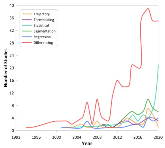 Trends in different Landsat change detection method categories over time.