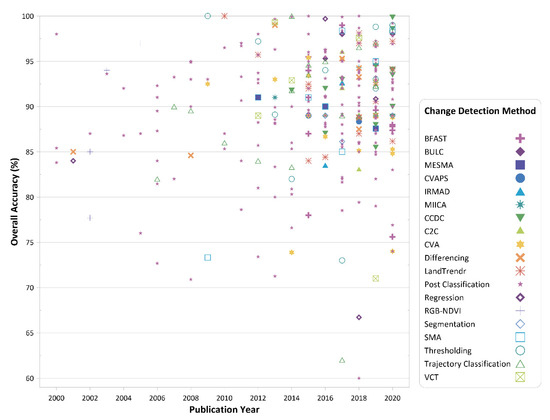 A scatter plot showing the different Landsat change detection methods and overall accuracies over time.