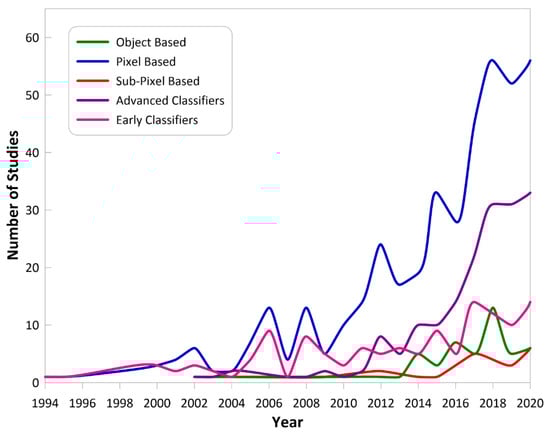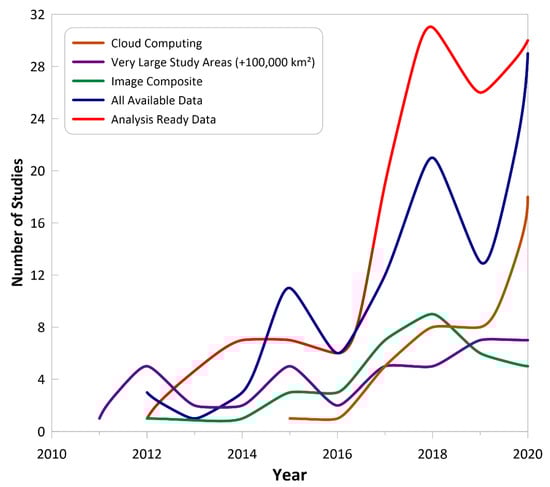 Early studies usually made efforts to select Landsat images with no or very little cloud coverage, and when necessary, masked cloud/cloud-shadows using manual digitizing or thresholding. However, accessing to annual cloud-free images in some geographical locations can be challenging and even impossible due to nearly permanent cloud cover conditions in some geographic regions. Figure 16 shows an increasing number of studies used automated cloud/cloud-shadow mask algorithms, as studies are increasingly using more frequent-date data. Amongst studies using high-frequency datasets, 76% used automated cloud masking methods. Some studies require annual or seasonal images, and to ensure per pixel quality of data, a composite image must be created from images available within a restricted period of time (e.g., available images in one season). Of investigated studies, 34 used image composite methods, such as best available pixel (BAP), to remove atmospheric effects and cloud/cloud-shadows and to choose the best observation per pixel. Other studies simply picked the median value or maximum of spectral indices (e.g., NDVI) of each pixel to create synthetic seasonal or annual images.
