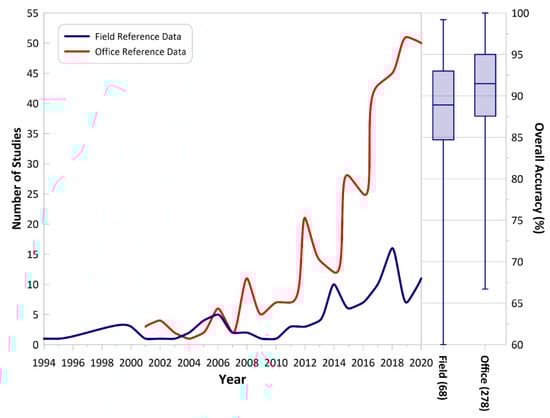 Improvements to data storage capacity and computational power have led to increasing application of change detection over geographically large study areas (see Figure 14). A study area with a large size allows for a more comprehensive understanding of patterns in land cover within and between regions. Additionally, some applications, such as climate change, are not limited to regional or national scales, but rather are relevant at the scale of the globe. However, there are still many studies covering small areas due to limitations in the amount and quality of reference data, as well as desired accuracy. Notably, of investigated studies over large area only 18% used field-collected reference data, as collecting reference data over large areas is time- and cost-inefficient. Of investigated research, 82% collected reference data in the office from high-resolution images such as Google Earth or existing land cover maps.