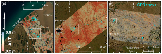 Ground penetrating radar (GPR) tracks displayed over the PDO product for the (a) BRW, (b) TOO, and (c) YKD swaths. The locations of these swaths are indicated in Figure 1. White boxes indicate locations shown in Figure 9. Latitude and longitude tick marks are in 5’ intervals. Dark patches within the terrestrial landscape are water bodies.