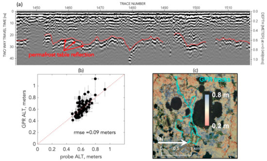 While our field ALT measurements were made in August rather than the end of the thaw season in September or October, we assume these measurements approximate maximum thaw due to the deceleration of the thaw front late in the season. While we do not have detailed models or timeseries data exactly at our swaths, we consider previously presented modeling results [11,15] that modeled active layer thaw dynamics at 70°N latitude. The results of these studies indicated that between August 14 (approximately the time of measurement of our field data) and the onset of freezing, the permafrost table only advanced 0.01–0.03 m, which is within the uncertainty of both our probing and GPR data. Therefore, we judge the seasonal timing of our data collection to have a negligible effect on the validation results.