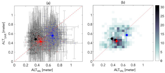 (a) ALT validation data compared against the collocated SAR result. Grey bars are individual estimated uncertainties (vertical error bars indicate posterior uncertainty for the PDO product; horizontal error bars indicate validation uncertainty from error propagation of the GPR errors, scaling errors, and representation errors); large colored markers are the average and standard deviations for each swath. (b) A 2D histogram, where grayscale indicates count, displaying the same data as in panel (a). Black, BRW; red, TOO; blue, YKD.