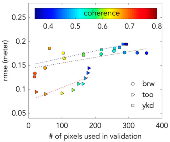 Including only the highest quality pixels in the validation reduces the RMSE (Figure 5). In Figure 4, we used all SAR pixels above the coherence threshold of 0.35. The magnitude of the correlation is referred to as the “coherence” [24]. As coherence increases, the uncertainty in the estimated ALT decreases, making it more difficult to reach the ideal match criteria in the χ2 statistic. Nevertheless, the higher quality pixels with high coherence show reduced RMSE. Setting a higher coherence threshold reduces the number of pixels in the validation statistics. For example, if we set the coherence threshold to 0.65, the RMSE decreases to 0.09 m, 0.16 m, and 0.17 m for TOO, BRW, and YKD respectively, while reducing the number of usable pixels in the validation statistics to about 300. Depending on the application, a user of the PDO dataset could define their own coherence threshold to focus on the highest quality pixels with the lowest uncertainties, at the cost of fewer usable pixels per swath and less spatially continuous data coverage.