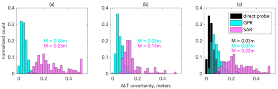 Here we address the uncertainty of each measurement method. For probing measurements, the only site where we have estimates of measurement repeatability is YKD. Given that these distributions appear to be skewed (Figure 6), particularly the SAR, we report the median rather than the mean. The probe measurements have the lowest uncertainty, likely because the primary sources of error are simply the operators’ judgment of the ground surface and the ability to read the 0.01 m graduations marked on the probe. The scaled GPR data has around double the uncertainty of the probe data, due to both velocity uncertainty and scaling. SAR uncertainty is two to three times larger than GPR due to errors both in the measurement (as a result of having infrequent acquisitions from airborne platforms), as well as assumptions in the conversion from subsidence to ALT. Please refer to [12] for more details on SAR uncertainties.