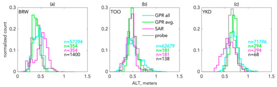Histograms of ALT for the (a) BRW, (b) TOO, and (c) YKD swaths.