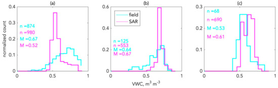Frequency distributions of VWC for the (a) BRW, (b) TOO, and (c) YKD swaths. Population counts, n, indicate the total number of individual depth-integrated VWC observations and the number of pixels for the field and SAR datasets respectively. M indicates median.