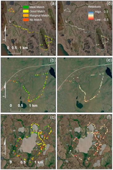 To illustrate how the χ2 classified pixels are distributed across the landscape, we present pixels along representative GPR tracks from each swath in Figure 9a–c. The tracks do not appear spatially continuous for two reasons: (1) we rejected SAR pixels with less than 30 validation ALT measurements, and (2) SAR pixels with coherence less than 0.35 are not used in the validation. Residuals are plotted spatially in Figure 9d–f. There are no obvious spatial patterns in either the classifications or the residuals (i.e., spatial patterns χ2 are approximately random), except that the residuals appear to be more positive in BRW and more negative in YKD, corresponding to the overall observed bias (Table 2). The approximate randomness of χ2 spatial patterns suggests that cases of marginal match or no march likely result from random noise than a systematic bias or problems with the PDO retrieval.