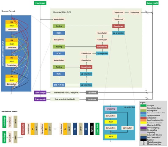 where denotes the up-sampling operation, , , and are the adaptive weights of the three different scales, introduced to allow effective learning of both large-scale and small-scale height variations. The three U-Nets, , where N denotes the depth of the multi-scale U-Net (N = 3, 4, 5), can be expressed as an encoding-decoding process as follows
