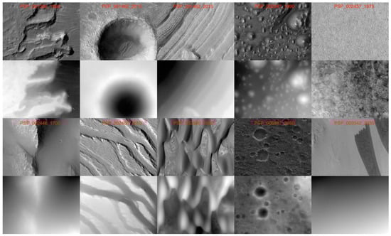 We form two sets of training datasets, for network initialisation and for full training. The first training dataset contains 4,200 (12,600 after data augmentation) pairs of cropped and randomly selected samples (512 × 512 pixels) of the ORIs and DTMs at lower spatial resolution (4 m/pixel) and is used for initial training of the network. Down-sampling of the original HiRISE ORIs and DTMs is achieved using the GDAL’s “cubicspline” resampling method (https://gdal.org/programs/gdal_translate.html (accessed on 21 July 2021)). For each DTM cropped sample, the height values are rescaled to relative floating-points values in the range of [0, 1] from their original min/max height values. Note that we do not normalise the digital values of the ORIs in this work. During the HiRISE cropping process, if any of the ORI or corresponding DTM crop contains “nodata” value, then the paired ORI and DTM samples are removed from the training dataset. The second training dataset contains 15,500 (46,500 after data augmentation) pairs of cropped samples (512 × 512 pixels) of the ORIs and DTMs downsampled at 2 m/pixel and is used for full training of the network. Some examples of the second training dataset are shown in Figure 3 (HiRISE image IDs are shown on each sub-figures). This collection of examples contains a variety of different surface features, such as large-structures, large-sized craters, layers on slopes, cones, small-scale semi-flat features, high-peaks, layered peaks, dunes, small-sized craters, and flat features on slopes (in the order of top-left-to-bottom-right).