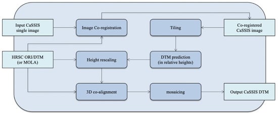 The MADNet single-image height prediction process still has several restrictions. In this section, we resolve these remaining issues with pre-processing and post-processing methods. Firstly, the input image size for MADNet is limited to 512 × 512 pixels subject to the design of the network and GPU memory constraints. In order to achieve full-strip DTM prediction, we need to use tiling and mosaicing processes at the pre-processing and post-processing. Secondly, the predicted heights are in relative height units with a scale of [0, 1] the same as the rescaled training datasets. In order to recover the absolute heights, we use reference HRSC DTM (for this work) or MOLA DTM (in general) to rescale the relative heights. Thirdly, the geo-information encoded within the CaSSIS images currently has a systematic error, due to issues with the onboard clock. In this case, we cannot directly use a MOLA DTM for rescaling as the spatial locations of CaSSIS are wrong. Therefore, we include image co-registration of CaSSIS and HRSC in a pre-processing in order to achieve the height rescaling using HRSC DTM.