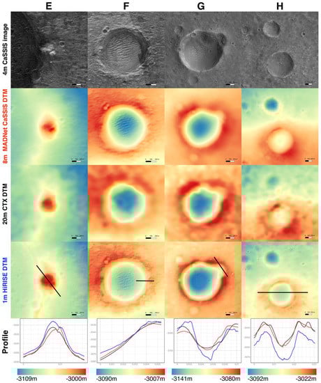 Zoom-in views of the 4 m/pixel CaSSIS image, 8 m/pixel MADNet CaSSIS DTM, 20 m/pixel CTX DTM, 1 m/pixel HiRISE DTM, and measured profiles (location shown on the HiRISE DTMs; black: CTX, red: CaSSIS, blue: HiRISE), for area (E–H) (location shown in Figure 5). All DTMs are colour hillshaded. To look into details—please refer to the full-resolution figures provided in Supplementary Materials.