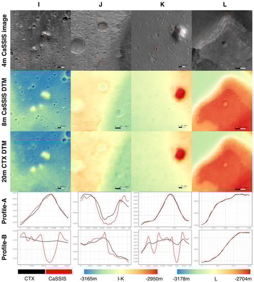 Zoom-in views of the 4 m/pixel CaSSIS image, 8 m/pixel MADNet CaSSIS DTM, 20 m/pixel CTX DTM, and measured profiles (location shown on the CaSSIS images; black: CTX, red: CaSSIS), for area (I–L), where there are no HiRISE stereo (location shown in Figure 5). All DTMs are colour hillshaded. To look into details—please refer to the full-resolution figures provided in Supplementary Materials.