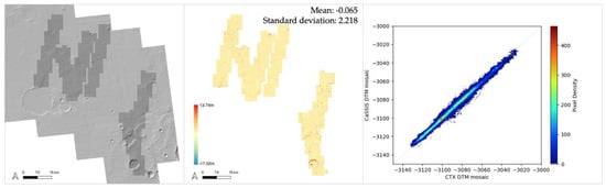 Hill-shaded image of the CaSSIS DTM mosaic superimposed on the hill-shaded image of the CTX DTM mosaic (left); difference map of between the CaSSIS and CTX DTM mosaics (middle); scatter plots of the CaSSIS and CTX DTM mosaics (right).