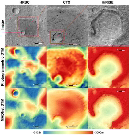 In terms of resultant DTM resolution, photoclinometry generally produces per-pixel height reconstructions, thus has the highest resolution. Photogrammetry generally produces the lowest resolution among the three approaches as “averaging” is consistently introduced over the whole workflow through the application of area-based image matching procedures. A deep learning-based method should produce resolutions similar to photoclinometry but depends on whether there is sufficient training data. Even though the proposed supervised method is trained with photogrammetric DTMs, we can down-sample such DTMs (and associated ORIs) to their effective resolution and perform pixel-level image-to-height training/learning. In this way, artefacts could be mostly eliminated as they mostly occur in fine-scale features (in the case of the HiRISE PDS DTMs). N.B. Training DTMs that have large-scale errors or strong noise have been pre-removed as stated in Section 2.3. This also explains how deep learning-based methods are not reproducing any artefact that might be contained in the original training data. For example, after training with the down-sampled data, the network has learnt how to produce the best DTM for an “artefact-free” big crater, then the learnt parameter sets can be used to produce the most appropriate DTM for a much smaller crater, where many artefacts may appear using photogrammetry.