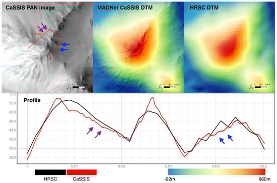 Figure 11 shows that metres to tens of metres details of the landslide and its surrounding terrain have been successfully captured by MADNet. Of particular interest is the fact that the topographic signature of the bedrock spurs located near the top of the escarpment are clearly visible. The topography of these spurs can give important information on erosion rates of the bedrock (e.g., [48]). In addition, the subtle topography related to the parallel ridges and troughs running northwest-to-southeast which represent the underlying crater ejecta, are also partially reproduced and their topographic relief can be used to better understand the surface over which the landslide propagated. Finally, the lateral levees, toe scarp, and detailed surface textures of the landslide deposits are reproduced (including superposed small craters), which is of use for understanding the dynamics of the landslide (e.g., [49]). On the other side, the CaSSIS DTM has not shown so well at the hundred-metre to kilometre-scale where some details have been smoothed out, including some of the bulges on the deposit and the fallen block of the plateau. This is mostly due to the final 3D co-alignment process using a coarse reference DTM that cancelled some of the large-scale topography or falsely correctly the MADNet DTM onto a reference that has large-scale artefacts. Please refer to Section 4.3 for discussions on this. This can be improved in the future using a coarse-to-fine approach (i.e., to produce MADNet HRSC DTM at higher resolution using MOLA as the reference, then produce MADNet CaSSIS DTM using the MADNet HRSC DTM as the reference).