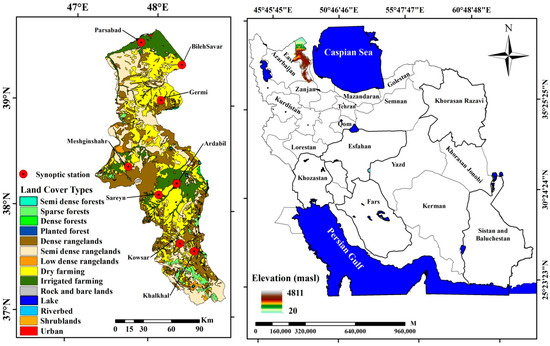 General view from Ardabil Province location, elevation, land cover, and location of synoptic stations [53].