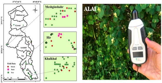 where, I and I0, respectively, represent the radiation intensity in the lower and upper parts of the vegetation. The ratio of I to I0 expresses the ALAI transmittance. K is the extinction factor dependent on the vegetation canopy shape, orientation, and position [15]. The reference value measurements for ALAI were also done in an open space. The Darband Hir, Neur, Kowsar, Meshginshahr, and Namin ecoregions (Figure 1) were subjected to LP 100 application in June 2020, and the rest of the ecoregions were considered in July 2020. In total, the collection period for LP 100 ranged from 13 June to 25 July 2020.