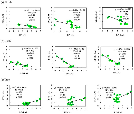 Scatter plots of remote sensing vegetation indices and LP-LAIs for different PFTs of (a) shrub, (b) bush, and (c) tree.