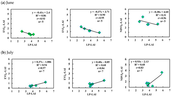 Scatter plots of remote sensing-based and LP 100 LAIs in (a) June and (b) July.