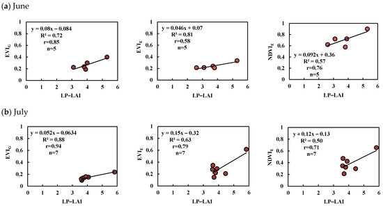 Scatter plots of vegetation indices and LP-LAIs in (a) June and (b) July.