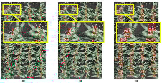 - Regression-based techniques: These methods can only count, as they regress the local count calculated from the density map, usually estimating non-integer counts. More information about the tassel’s location and number—for example, the number of true positives (TP), false positives (FP), and false negatives (FN)—cannot be determined. However, these techniques are faster than detection-based approaches. TasselNetv2+, which was introduced to count tassels based on regression CNN [17], has undergone multiple improvements through subsequent implementations. Visual context was added to the local patches in the CNN in TasselNetv2 [18], and the first layer of the CNN was modified with global average pooling and implemented using PyTorch in TasselNetv2+ [19]. All three implementations use point annotation.