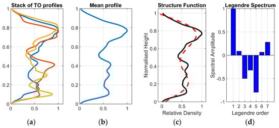 Normalized vertical profile stack (a), the mean profile for the TO complexity class (b), mean TO profile (black) and Legendre approximations (red dash) (c) and the corresponding 6th order Legendre spectra (d).