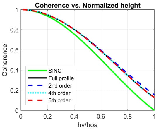 To address this question, we provide an example using profiles for single-layer (SI) forest stands, which represent less than 10% of the forest stands in the PRF. Figure 7a shows the 6th order Legendre approximation (red dash) overlaid on top of the mean SI GEDI profile (black) and the corresponding Legendre spectral amplitude. Figure 7b shows the SINC, 2nd, 4th, and 6th order Legendre approximation. Similar to the two-layer (TO) stands in Figure 3, the SINC reference (green) provides a lower bound on canopy height estimates for any given coherence. The other curves diverged from the SINC with increasing hv/hoa ratio. The Legendre approximation varies with different profiles, such as SI and TO, but whatever its spectrum, the Legendre will provide an increased height estimate for a given coherence, relative to the SINC. For a best-fit profile, the 6th order Legendre approximation (red dash) in both cases apparently sits very well on top of the black curve from the full resolution of a vertical profile. However, the 4th order (cyan dash) also converges well on the black curve for both the SI (Figure 7b) and TO profiles (Figure 3), indicating that the 4th order Legendre approximation may be sufficient for Legendre canopy height estimation in some forest environments; however further investigation is required. The examples shown in Figure 3 and Figure 7b can aid in finalizing how many orders of Legendre approximation are needed and thereby set the spatial frequency requirements for useful profile estimation.