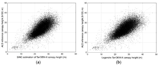 SINC (a) and Legendre (b) TanDEM-x canopy height estimates plotted against ALS h100 reference estimates.