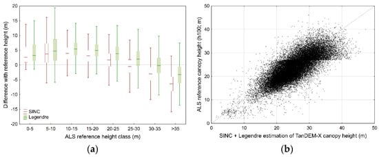 Distribution of differences between the SINC and Legendre TanDEM-X canopy height estimates and the reference ALS-derived h100 canopy height estimates, by 5-metre height classes. Boxplots indicate the median, 25th–75th percentiles, and non-outlier range. (a) SINC + Legendre canopy height estimates plotted against ALS h100 reference estimates (b).