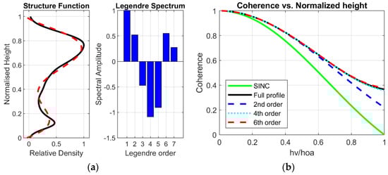 The very first function of the Legendre coherence series is the SINC function, the most dominant single function in determining coherence (which supports the use of the SINC function approximation in several previous publications [6,7,23,24]). However, the other functions can be important (depending on the spectrum and βv) for the correction of SINC underestimation of canopy heights for certain forest structures. We now turn to consider some example profiles and their spectra.