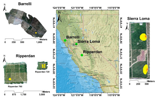 The experiment was conducted within three different climate regions located in California, as shown in Figure 2. All of these sites are part of the Grape Remote Sensing Atmospheric Profile and Evapotranspiration eXperiment (GRAPEX) project [54], led by the USDA ARS in collaboration with E&J Gallo Winery, University of California in Davis, Utah State University, NASA, and others. The overall objective of the GRAPEX project is to provide the vineyard manager and grower with spatially distributed, remotely sensed ET information for improving irrigation water use efficiency and detecting crop stress in multiple vineyard blocks. This would facilitate water conservation efforts in California’s Central Valley, which has been experiencing frequent and severe drought conditions. The project began in 2013 at two pinot noir blocks located within the Sierra Loma Vineyard near Lodi, California () in Sacramento County (see Figure 2) [7]. The two vineyard blocks, north and south, differed in maturity and age, having been implemented in 2009 and 2011, respectively. The configuration of the trellising system in both fields is the same, with vine trellises 3.35 m apart and an east–west orientation. In 2017, the GRAPEX project extended the observations to include two additional vineyards: Barrelli vineyard (), located near Cloverdale, California, and Ripperdan vineyard (), located near Madera, California. With the expansion of the GRAPEX project from Sierra Loma to the Barrelli site to the north and Ripperdan to the south, a large range in trellis designs, climate regions, vine varieties, canopy structure, and vine physiology are represented. The Ripperdan vineyard was planted in 2009, whereas the Barrelli vineyard was implemented in 2010. Both the Barrelli and Ripperdan vineyards employ different plantation structures and vine varieties. The vine rows in Barrelli have a northeast–southwest row orientation, with a row spacing of 3.35 m and predominately Cabernet Sauvignon vine variety, while in Ripperdan, the row direction is east–west, with a row spacing of 2.74 m growing Chardonnay and Merlot. Data collection campaigns/intensive observation periods (IOPs) in these sites were conducted in the veraison period (from mid-July to early August), when the crop evaporative demand increases.