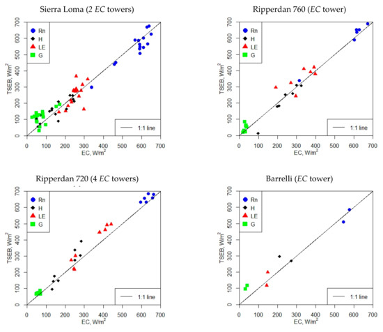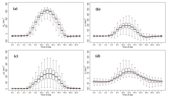 Different graphical representations were used to visualize and evaluate the datasets from the EC towers and the performance of the extrapolation techniques. Boxplots were created to describe the variance of surface energy fluxes (Rn, H, LE, and G) at each hour in the dataset. Boxplots were also used to evaluate the performance of the five daily ET extrapolation schemes by presenting the distribution of relative error at each individual hour during the daytime, as shown in the Appendix. Moreover, scatterplots were used to compare the modeled fluxes from TSEB and the measurements from EC systems to evaluate model performance.