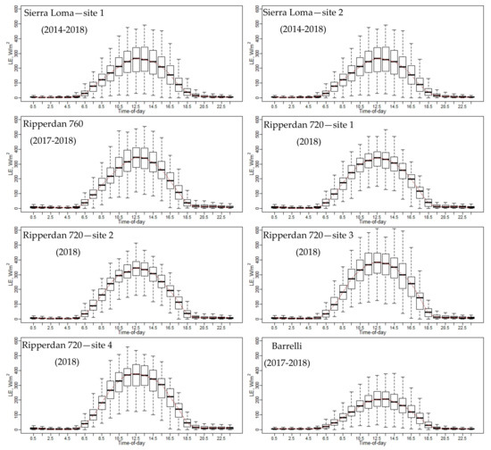 Figure 5 shows the LE diurnal variation at each individual EC tower included in this study. The boxplot at every hour represents the seasonal variation from April to October due to weather changes and irrigation scheduling. Overall, the general temporal trend of the LE has a shape that resembles solar radiation at different vineyard sites, with a peak value near solar noon, between 1030 and 1330. In early morning and overnight, the LE values were close to zero. Comparing the diurnal variation of LE at different vineyards, the Barrelli site had the lowest LE values. The Barrelli vineyard is located near the Pacific Coast shoreline, which brings cool maritime air that cools the warm interior valleys. The cool and moist air over Barrelli is associated with a decrease in the vapor pressure deficit (VPD) and more cloudiness, which causes a decrease in ET demand. In Sierra Loma and Ripperdan, the VPD and air temperature were higher than Barrelli, as both sites are exposed to a warm Mediterranean climate, which is characterized by abundant sunshine and a large day-to-night temperature difference and, therefore, increases the ET demand [66].